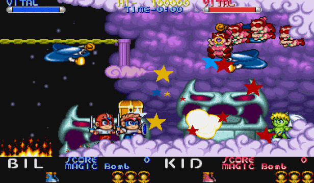 La conversión para la consola de SEGA vio la luz en 1993 y Capcom nos presentaba un titulo para 1-2 jugadores prácticamente idéntico a la recreativa. Como ya he comentado un poco más arriba, fuera de Japón y en algunos otros países se conoció al juego con el nombre de Mega Twins, y es que los protagonistas eran dos simpáticos hermanos gemelos que van armados con una espada pequeña y un escudo, eliminando monstruos y demás bichejos con muy mala baba, atravesando un mundo lleno de plataformas y colorista a más no poder.