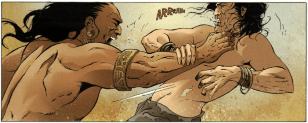 Comandados por Catalina –una mujer soldado-, Hernando Royo, nuestro protagonista y en quien se centra la historia (un soldado valiente, sin miedo, con fantasmas personales pasados que le atormentan), Saltamontes (un joven soldado aficionado a innovar con recetas de cocina nada…ejem…saludables), Burro (un soldado con mucho músculo y poco cerebro) y el padre Cristóbal (un cura muy poco ortodoxo), este grupo de personas serán los encargados de robar para Cortés. Todo parece fácil, a priori, hasta que en pleno robo les descubre Oczu, el encargado de los sacrificios humanos aztecas y sus hombres. A partir de ese momento se inicia una persecución a través de la selva de los soldados de Moctezuma tras este variopinto grupo. Además, al robar el tesoro sagrado azteca, los españoles se han llevado un misterioso amuleto y al hacerlo han despertado un ancestral espíritu-demonio que también les persigue. Esta es la trama principal de Conquistador, la cual se complementa con la mini guerra civil española entre Hernán Cortés y Pánfilo de Narváez, y las tramas palaciegas de Moctezuma y Oczu, con este último convenciéndole de que los españoles no son dioses, ni enviados de estos, y de que masacre a Cortés y sus hombres cuando este regrese. Esta sinopsis es lo bastante atractiva como para adentrarse en este integral que contiene los cuatro tomos originales.