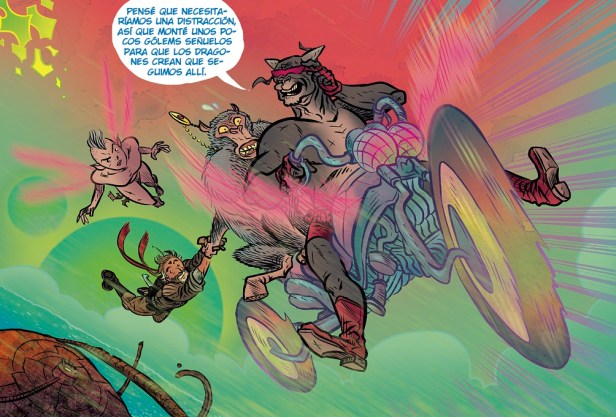 El guion de Matt Kindt quizá es más liviano que en el primer tomo aunque también es cierto que, una vez conocemos a los personajes, el siguiente paso es verlos en acción por los diferentes paisajes de Ether. También echo en falta algo de esa ornamentación al guion que tenía «La Muerte de la llama dorada» pero lo cierto es que en este segundo volumen es muy entretenido ver cómo Dias y sus amigos se enfrentan juntos a peligrosos enemigos, superan desafíos delirantes y conocen a nuevos habitantes de Ether como Agripa (con su guiño pop que le añade Rubín en la indumentaria), Galo Animin y, por supuesto, a los impresionantes gólems de cobre.
