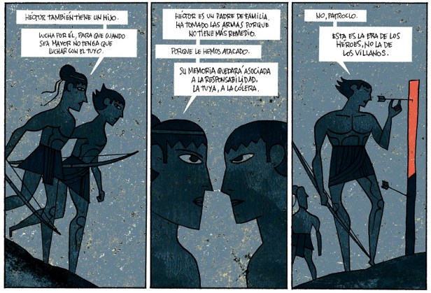 «La Cólera» (título que alude directamente al Canto I de la Ilíada) revisa acertadamente la épica historia del guerrero griego y sus mirmidones, actualizándola y logrando que, aquellos conocedores de la inmortal obra de Homero, tras la lectura de esta pequeña joya del cómic español, nunca más vuelvan a verla de la misma manera. Esta es, sin duda, una de las mayores virtudes de esta obra que cuenta con un guion ágil, y, sobre todo, inteligente, de Santiago García. Profundo conocedor del lenguaje del medio, se permitirá el lujo aquí de introducir conceptos modernos enriquecer la leyenda de Aquiles, el semidiós con un conflicto interno entre las cualidades divinas y su parte más humana, que desempeñó un importante papel en la guerra de Troya.
