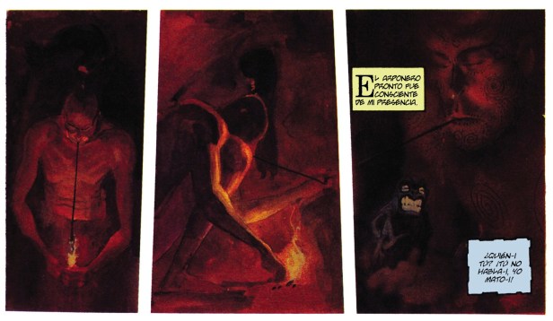 El relato del escritor neoyorquino, publicado en 1851, es uno de los más famosos de la literatura contemporánea y un mito de la cultura popular gracias también a la famosa adaptación cinemátografica de 1956, dirigida por John Houston (memorable la interpretación aquí del legendario Gregory Peck) y tuvo en 1990 su particular adaptación al cómic dentro de la línea Classics Illustrated en la que, lo primero que llama la atención es, obviamente, el enorme trabajo pictórico de Sienkiewicz, famoso por trabajos como ‘Moon Knight’ (El Caballero Luna), ‘New Mutants’ (Los Nuevos Mutantes) o ‘Elektra Assassin’ (Elektra Asesina), por citar sólo algunos. Con un estilo inconfundible ya (recordemos que por aquella época estaba en lo más alto de su carrera por cosas como Stray Toasters, una serie limitada aclamada por crítica y público), el artista opta por una paleta de colores oscura que gráficamente dota al cómic de las mismas sensaciones trágicas que se reflejan en la novela original de Melville.