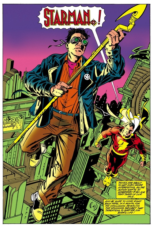 Los conceptos sobre los que se asienta esta serie son harto interesantes. Para empezar, una de las principales cuestiones que aborda el cómic de manera magistral es el concepto del legado. Pero además, visto desde un prisma que ha resistido el paso del tiempo estupendamente. El personaje de Starman, nos es traído aquí en forma de sucesor que no quiere ni ha pedido ser un héroe. Ted Knight, el Starman original está ya muy mayor. Hace tiempo que pasó el testigo a su hijo David, a priori el perfecto para asumir el manto del superhéroe. En cambio, su otro hijo, Jack, es la oveja negra de la familia. Jack es díscolo, rebelde y un joven al cual no le interesa para nada la faceta superheroica de la familia. Jack sólo quiere dedicarse a su tienda de antigüedades y a coleccionar cachivaches.